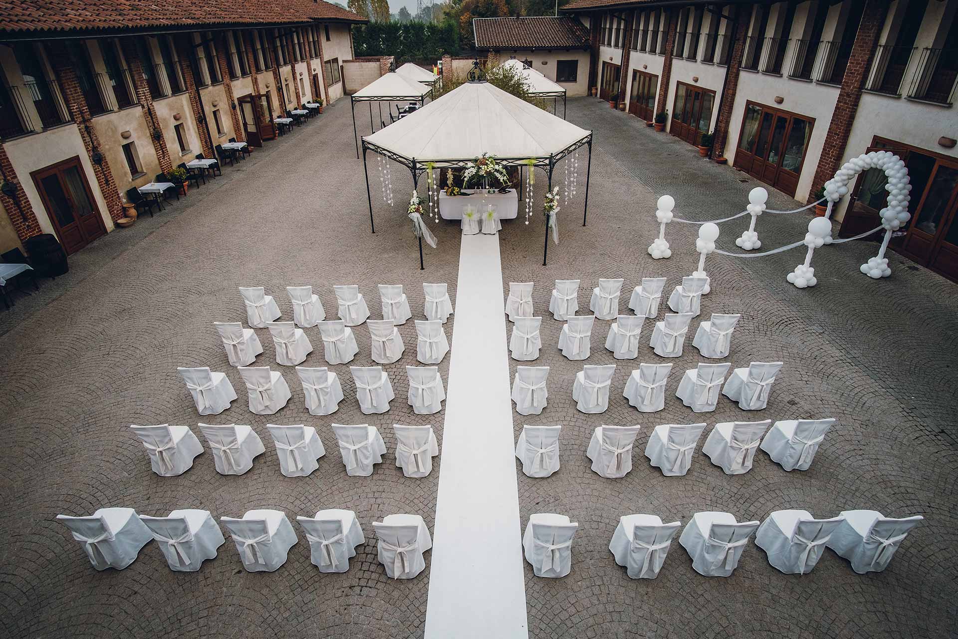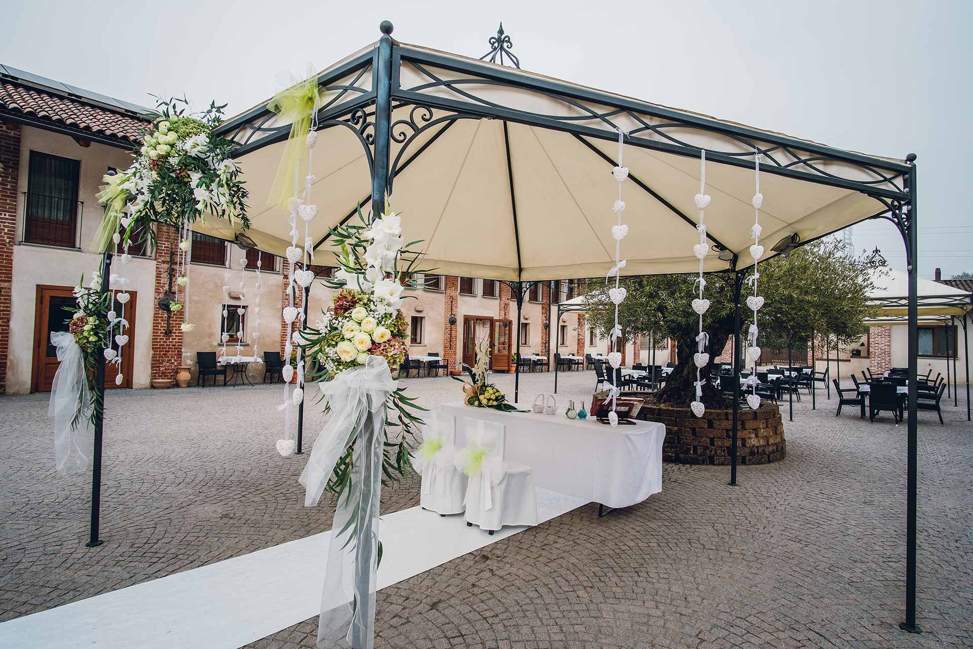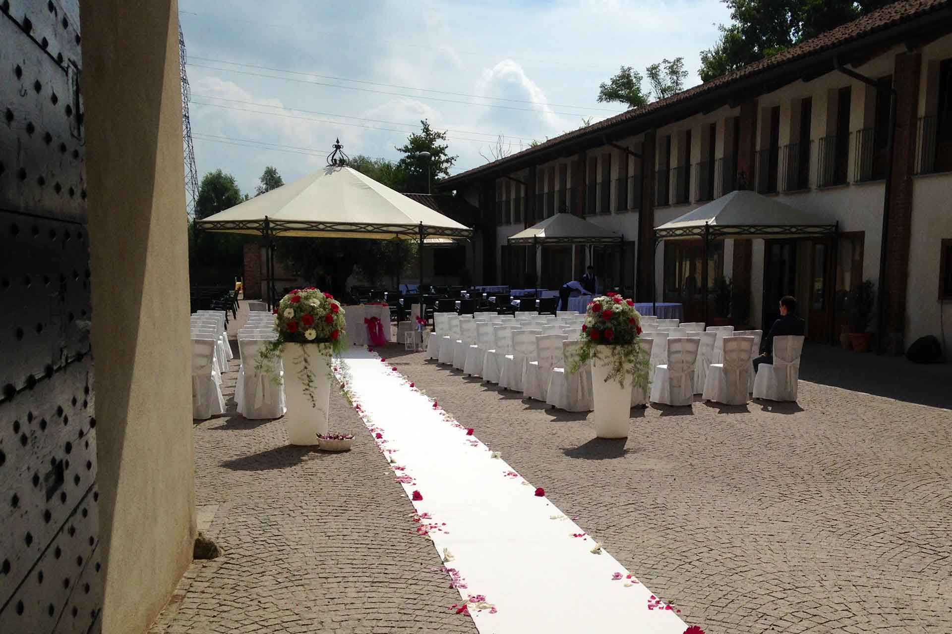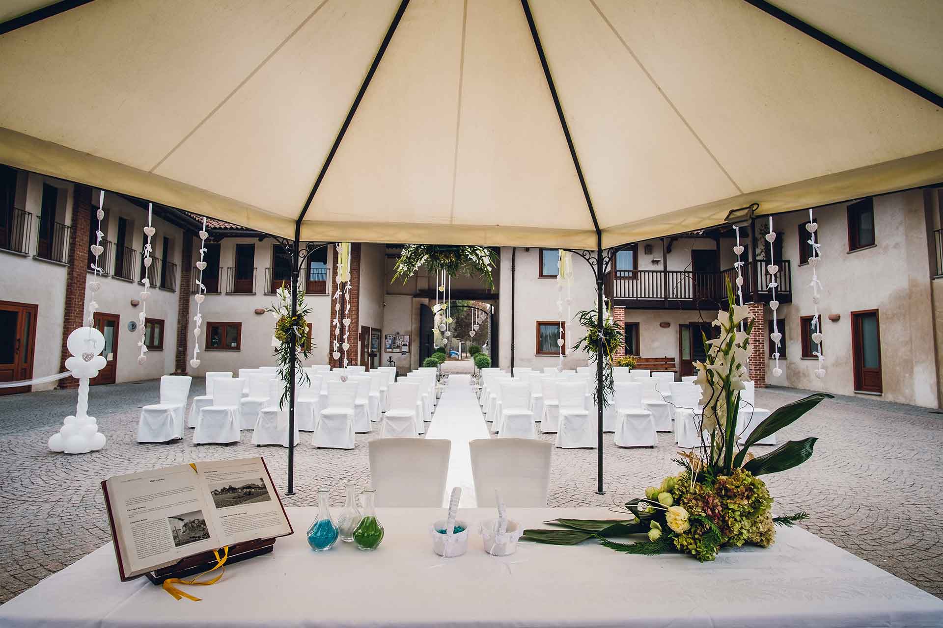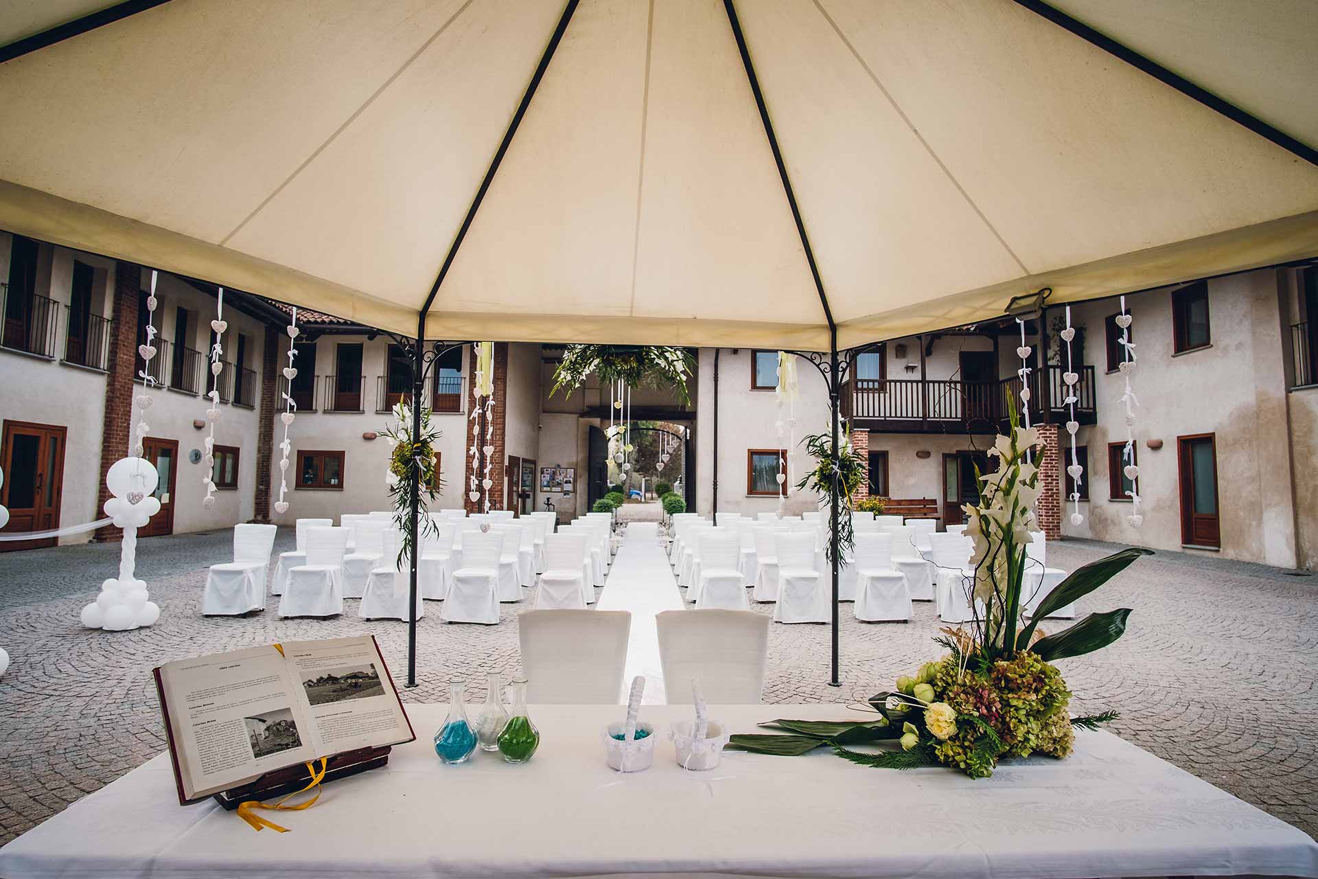 La cerimonia, allestita nella splendida corte, ha il vantaggio di poter essere totalmente personalizzata: dalla marcia nuziale, ai discorsi di amici fino allo scambio delle promesse. Potrete passare direttamente dalla cerimonia ai festeggiamenti perché tutti gli invitati saranno già insieme a voi.